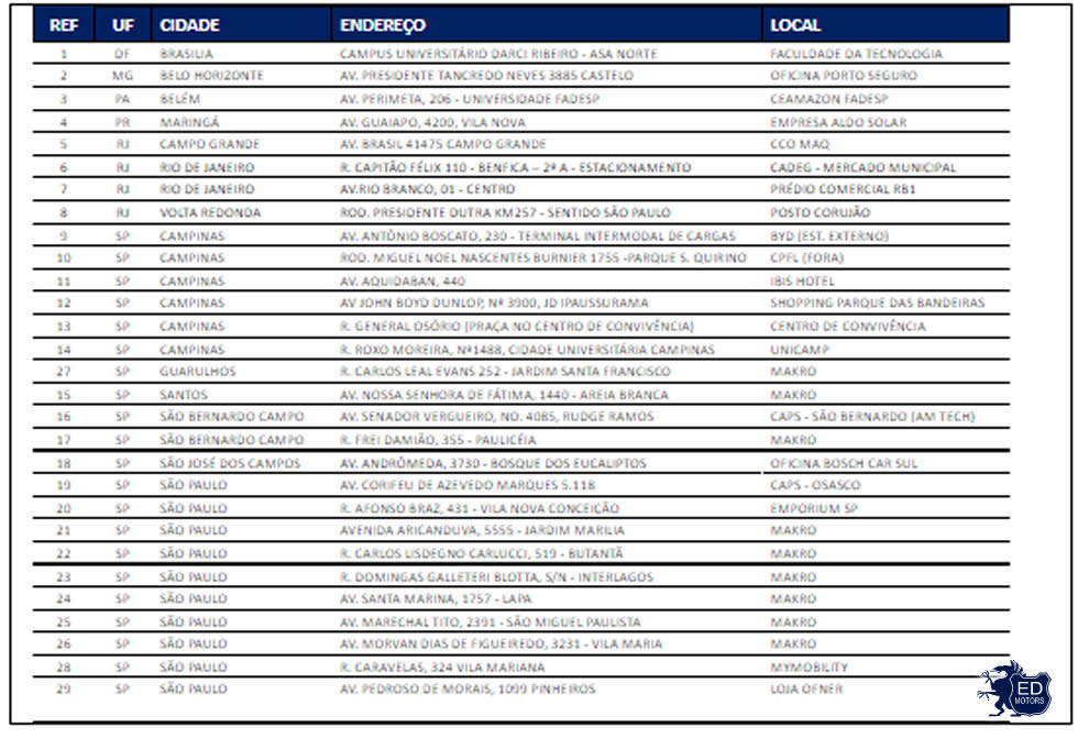 Atualmente, todos os carregadores instalados nos quase 30 pontos disponíveis são da BYD do tipo 2 Padrão Europeu de 40kw. Com a chegada dos novos carros, serão homologadas novas parcerias, uma vez que a empresa ainda não dispõe do padrão DC, que é um carregador