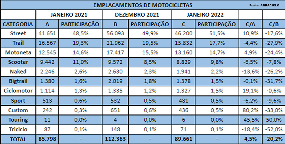 Com 46.200 unidades emplacadas e 51,5% do mercado, a Street foi a categoria mais licenciada em janeiro. Em segundo lugar, ficou a Trail (15.832 unidades e 17,7% do mercado), seguida pela Motoneta (13.160 motocicletas e 14,7%).