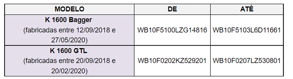 A BMW Motorrad Brasil convoca os proprietários das motocicletas BMW K 1600 GTL e BMW K 1600 Bagger, fabricadas entre setembro de 2018 e maio de 2020, a entrarem em contato com um concessionário autorizado para agendar gratuitamente um atendimento em razão de risco relacionado ao suporte pivô da suspensão traseira. Ao todo, 47 motocicletas estão envolvidas.