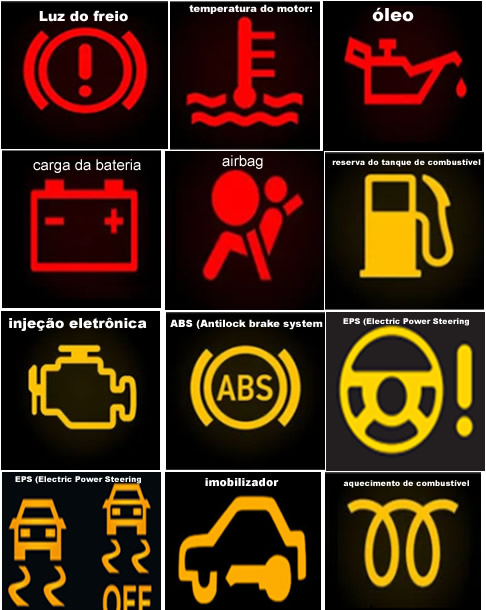 Além das cores, cada luz do painel apresenta um símbolo com um significado diferente e cada figura indicará qual parte do veículo está acionado ou com problemas.