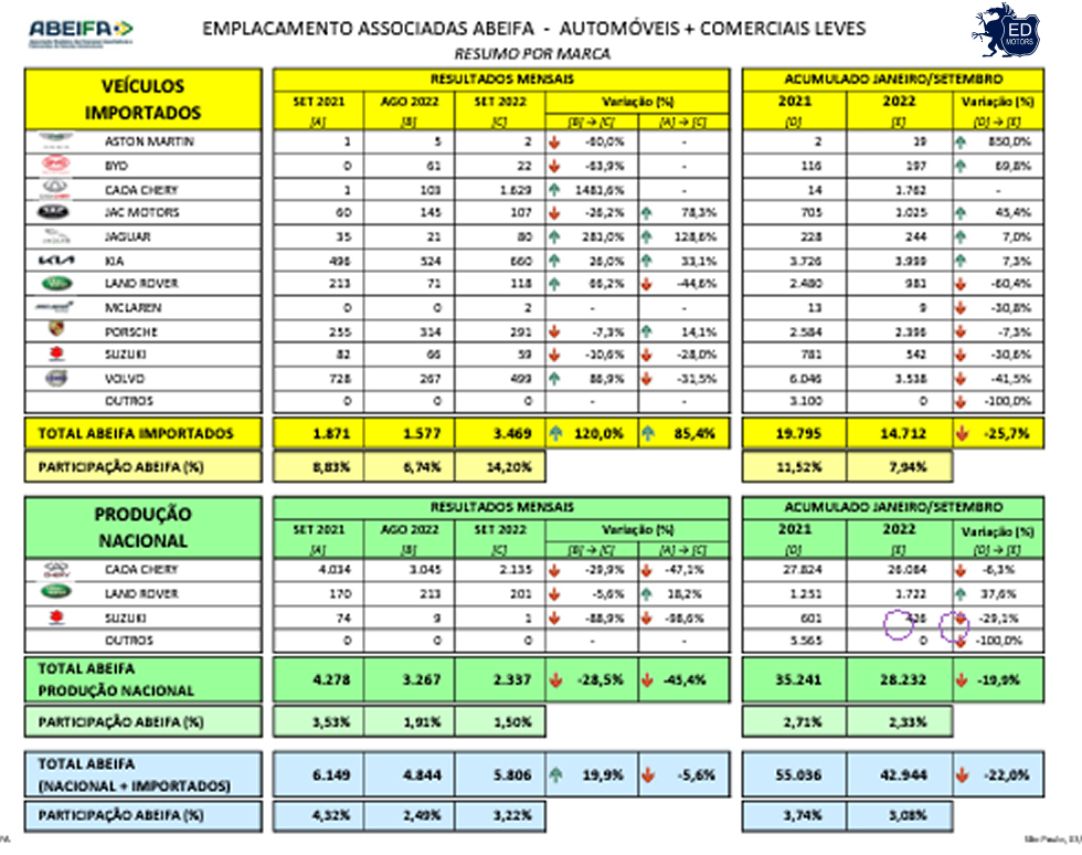 Na importação, as 3.469 unidades vendidas significaram aumento de 120% ante as 1.577 unidades de agosto de 2022 e de 85,4% ante setembro de 2021; enquanto na produção nacional – com 2.337 unidades – a baixa de vendas permaneceu, de 28,5% ante as 3.267 unidades do mês anterior, e redução ainda mais significativa de 45,4% em relação a setembro de 2021 (4.278 unidades).