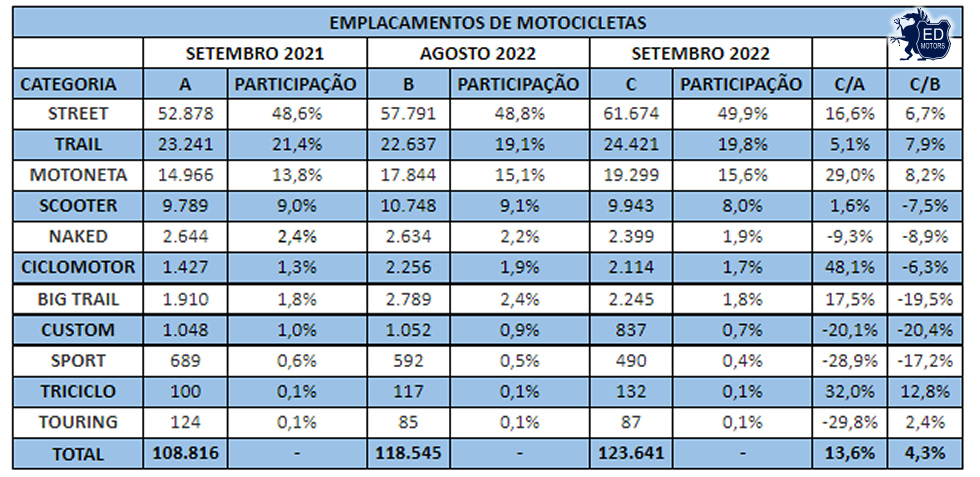 Com 61.674 unidades e 49,9% de participação no mercado, a Street foi a categoria mais licenciada em setembro. A Trail ficou em segundo lugar (24.421 motocicletas e 19,8% dos emplacamentos), seguida pela Motoneta (19.299 unidades e 15,6%).