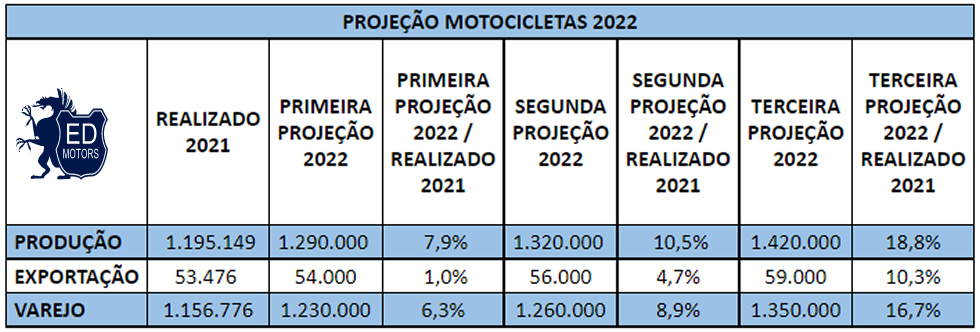 A Abraciclo também revisou as projeções para as vendas no varejo e exportações. A nova estimativa é de que sejam licenciadas 1.350.000 motocicletas, aumento de 16,7% na comparação com as 1.156.776 unidades registradas no ano passado. Para as exportações, a projeção é que sejam embarcadas 59.000 motocicletas, volume 10,3% superior às 53.476 unidades exportadas em 2021.