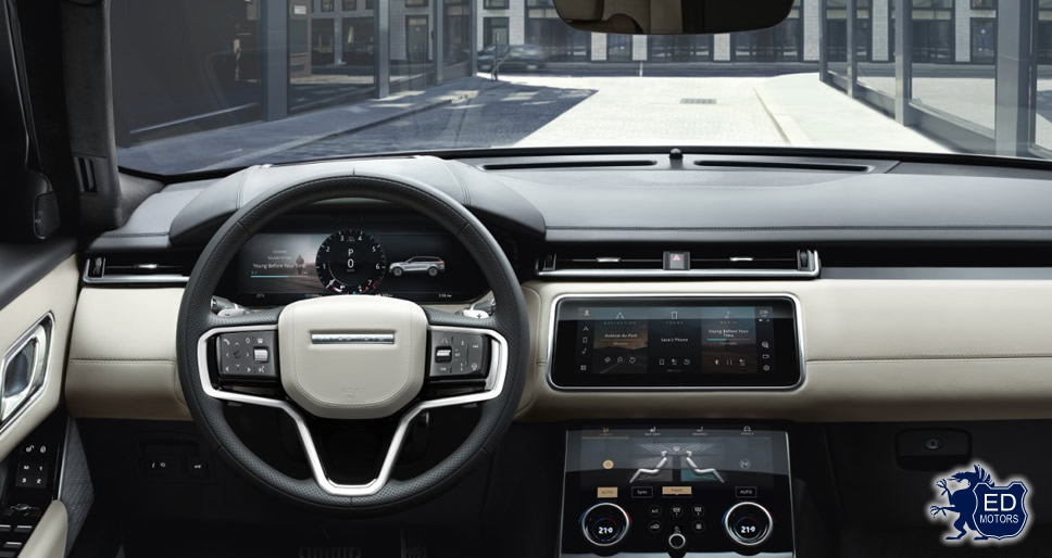 O conceito dinâmico externo se estende ao ambiente interno, tanto pelo espaço arejado e iluminado, proporcionado pelo teto solar panorâmico com abertura, quanto pela experiência de direção. Para garantir o equilíbrio entre conforto e agilidade, o Range Rover Velar vem equipado com tela de TFT de alta resolução e tecnologias como Head-up Display e Controle de Cruzeiro Adaptativo, que permitem ao motorista ter muito mais consciência de seus arredores e das condições do carro com tranquilidade, contribuindo para uma condução mais segura.