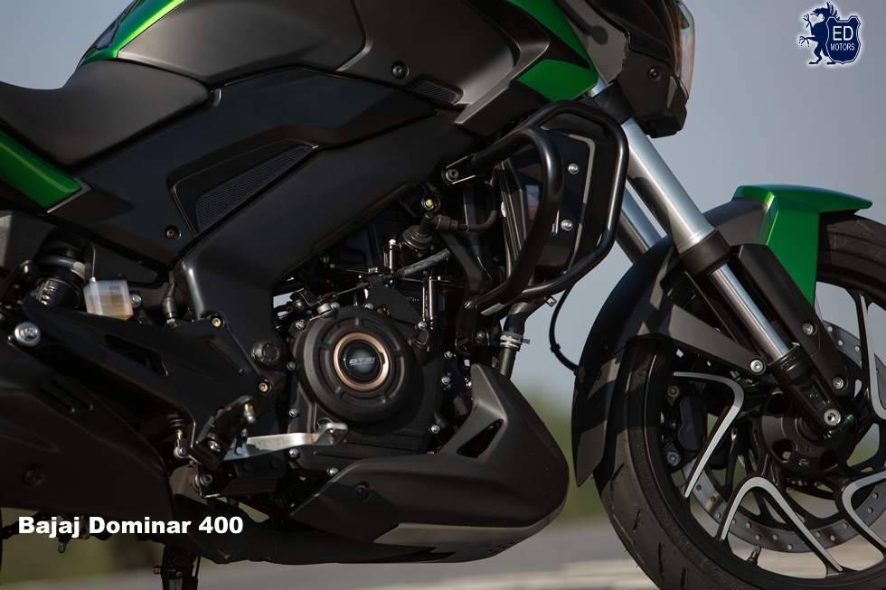 A Dominar 400 possui motor monocilíndrico, arrefecido a líquido, com 373,3 cm3 de cilindrada. Possui 4 válvulas por cilindro (2 de admissão e 2 de escape), DOHC (duplo comando de válvulas no cabeçote) e, ainda, o revolucionário sistema de injeção eletrônica da Bosch e de ignição DTSi, composto por três velas. Com câmbio de 6 marchas e embreagem deslizante, ela é altamente dócil para ser pilotada no tráfego urbano, rendendo um torque abundante desde os baixos regimes de rotação, evitando que o condutor necessite de constantes reduções de marchas. Já nas médias e altas velocidades, ela corresponde à exigência de desempenho, exibindo um conjunto leve e eficiente.