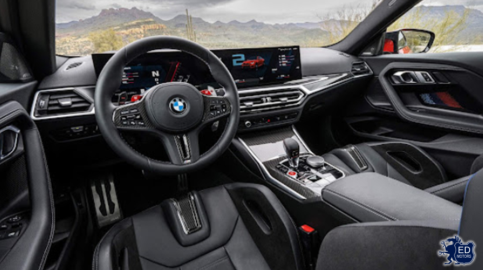 Por dentro, o destaque é o BMW Live Cockpit Professional, uma incrível tela curvada, composta por duas telas, com 12,3″ (painel de instrumentos) e 14,9″ (multimídia). Presente em outros modelos da marca, o sistema exibe informações de maneira clara e intuitiva, facilitando a pilotagem do esportivo. Como todo BMW M que se preze, o novo M2 é repleto de acabamentos de fibra de carbono na cabine. Os bancos, na versão Track, são tipo concha e com estrutura deste material nobre e tão desejado em carros com apelo esportivo.