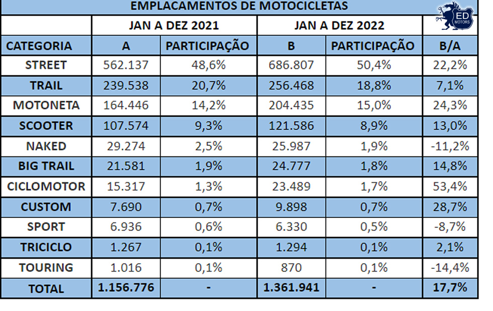 Confira o ranking de emplacamentos por categoria e a comparação com o mês e ano anteriores: