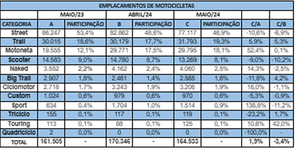 No quinto mês do ano, que teve 21 dias úteis, a média diária de vendas foi de 7.835 motocicletas. As motocicletas de baixa cilindrada foram as mais licenciadas e responderam por 80,4% do mercado. Já os modelos de média cilindrada tiveram 16,8% de participação e os de alta cilindrada, 2,9%.