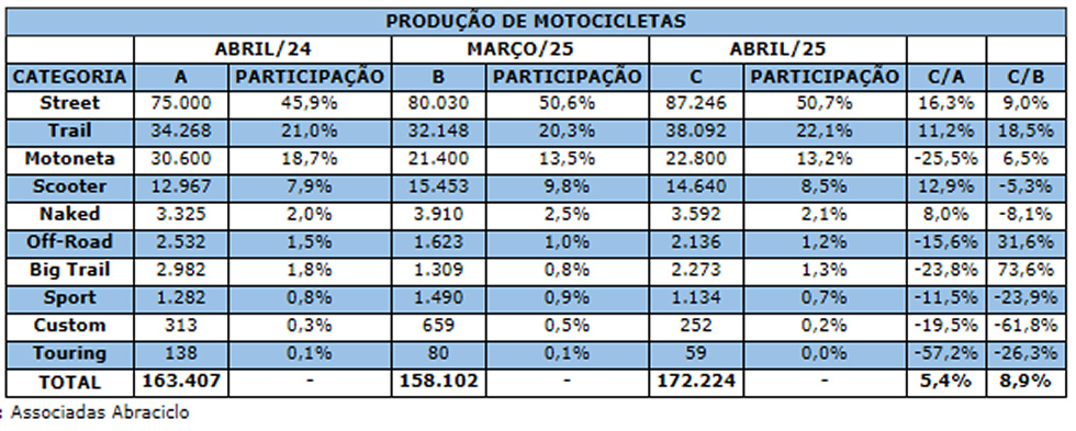 Com 51,5% do volume produzido, a Street liderou o ranking das categorias mais fabricadas no primeiro quadrimestre. Em segundo lugar ficou a Trail, com 20,7% da produção, seguida pela Motoneta (13,4%).