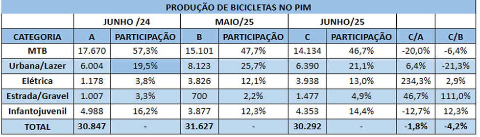 A Mountain Bike (MTB) foi a categoria mais produzida no primeiro semestre. No total, foram fabricadas 94.386 unidades, o que representa 52,3% do volume total. Em segundo lugar, ficou a Urbana/Lazer (19,7% da produção), seguida pela Infantojuvenil (14,3%).